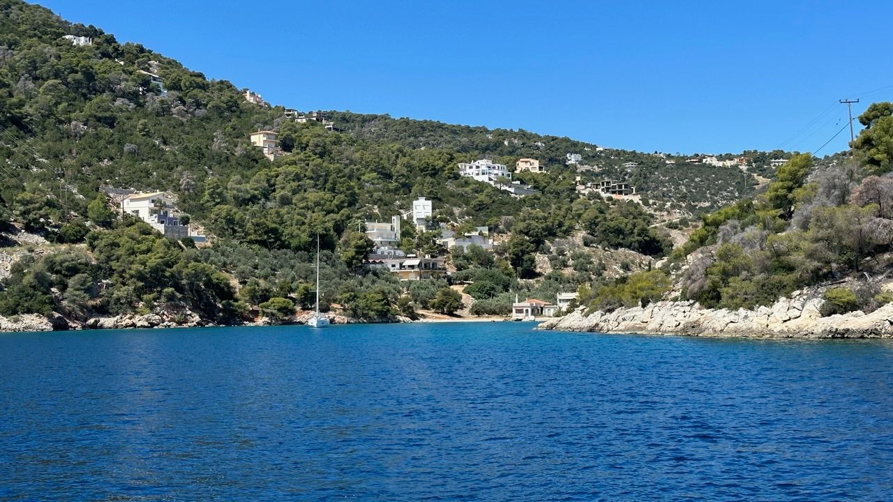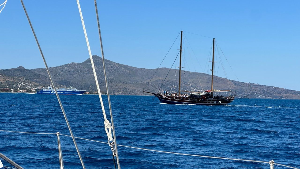 Am Morgen des 6. Mai brachen wir auf Richtung Ägina, einer Insel, die mitten im Saronischen Golf liegt. Zuerst war weit und breit kein anderes Boot zu sehen und Wind war praktisch nicht vorhanden. Als wir uns am Nachmittag Ägina näherten, änderte sich beides. Hochgeschwindigkeitskatamarane, Ausflugsschiffe und andere Segelschiffe machten das dann möglich gewordene Segeln zusätzlich interessant. Ein ruhiges Plätzchen fanden wir schließlich im Hafen von Perdika. Die Plätze an den Anlegestegen waren belegt oder wurden für eine Flottille freigehalten. Kurzerhand warfen wir unseren Anker und waren zufrieden. 😊